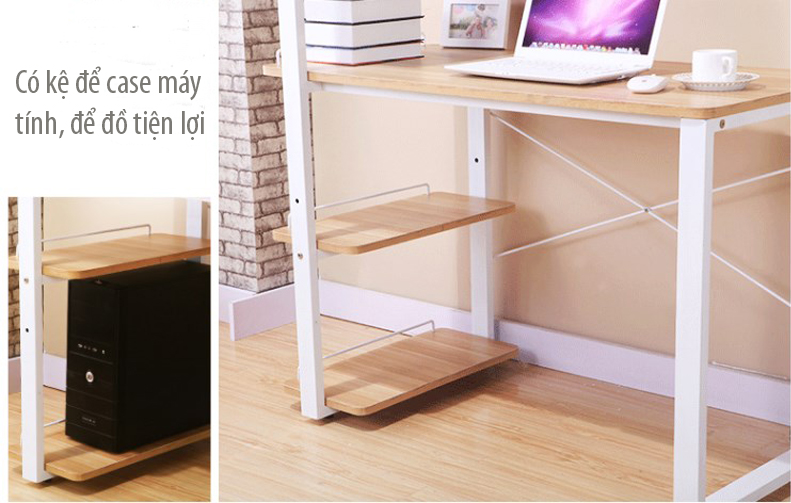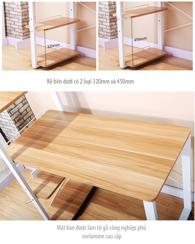 – Kệ đi kèm bàn không chỉ có thể để sách, tài liệu mà còn để được các vật dụng trang trí vừa tăng tính thẩm mỹ vừa giảm bớt gánh nặng cho phần mặt bàn.