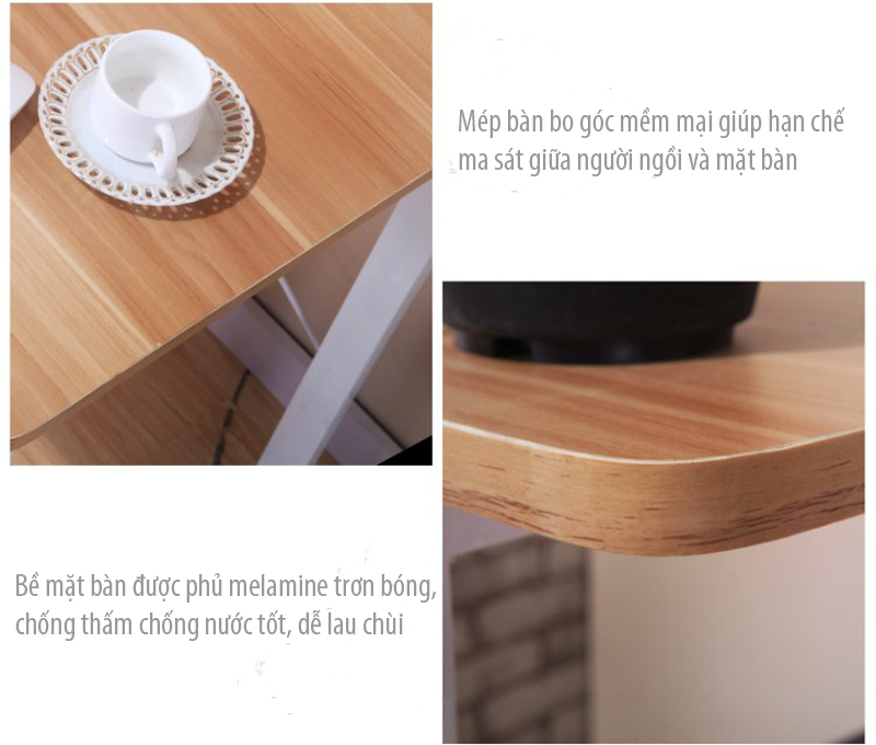 Sản phẩm được làm từ bề mặt gỗ công nghiệp phủ Melamine cao cấp với phần chân thép được sơn tĩnh điện cao cấp giúp chống gỉ, bền chắc, khả năng chịu lực tốt.