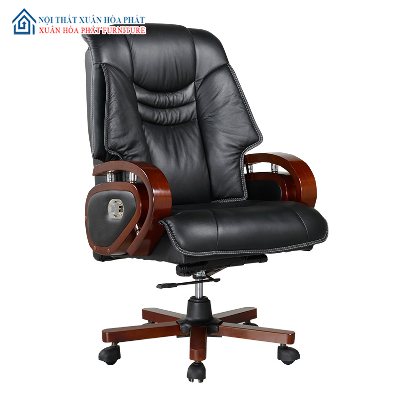 – Hai tay ghế được thiết kế tinh tế và đầy quyền lực, Khung và chân gỗ được chế tác trơn bóng tỉ mỉ, tạo cảm giác chắc chắn, sang trọng. Bên hông là lẫy kéo giúp ghế có thể ngã ra sau tiện lợi. Tay ghế vịn cố định hình tròn được làm bằng gỗ tự nhiên sơn PU 2 tầng và kết hợp ốp PVC 4 mặt sang trọng, độ cao vừa tầm với mặt bàn làm việc, không gây cản trở khi đẩy vào hoặc đẩy ra.