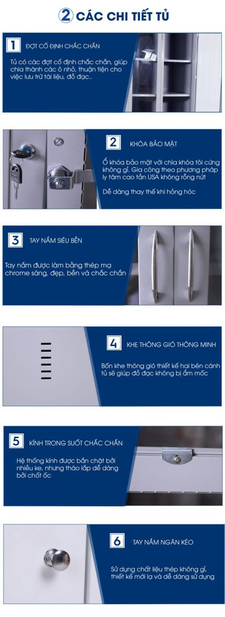 • Tủ chia làm nhiều ngăn riêng biệt có kích thước bằng nhau, có khóa an toàn.